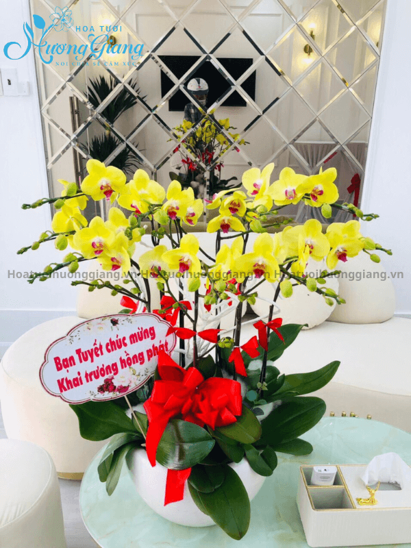 Hãy cùng Hoa Tươi Hương Giang tham khảo Chậu Lan Hồ Điệp Vàng 9 Cây – LHĐ 10 ngay bên dưới nhé: