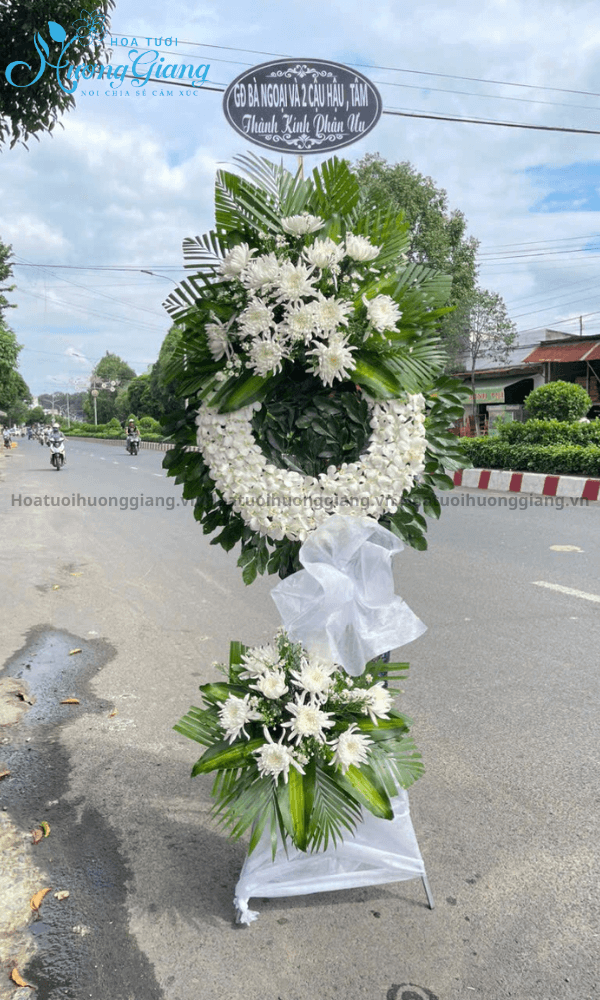 Hoa Kính Viếng thiết kế hiện đại theo tone màu trắng  là vòng hoa chia buồn bảy tỏ mong muốn sẻ chia nỗi buồn với gia chủ và nguyện cầu cho người mất được an nghỉ. Đi kèm với hoa cùng lời nhắn gửi chia buồn như: kính viếng, thành kính phân ưu, vô cùng thương tiếc, chia buồn.