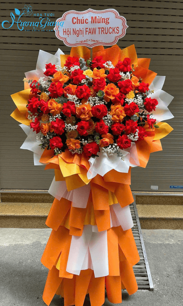 Hãy cùng Hoa Tươi Hương Giang tham khảo Lẵng Hoa Chúc Mừng Rực Rỡ – KT 86 ngay bên dưới nhé: