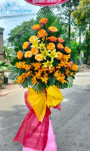 Hãy cùng Hoa Tươi Hương Giang tham khảo Lẵng Hoa Chúc Mừng Rực Rỡ – KT 86 ngay bên dưới nhé: