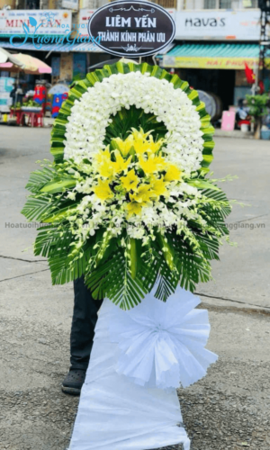 Vòng Hoa Chia Buồn thiết kế hiện đại theo tone màu trắng là vòng hoa chia buồn bảy tỏ mong muốn sẻ chia nỗi buồn với gia chủ và nguyện cầu cho người mất được an nghỉ. Đi kèm với hoa cùng lời nhắn gửi chia buồn như: kính viếng, thành kính phân ưu, vô cùng thương tiếc, chia buồn.